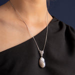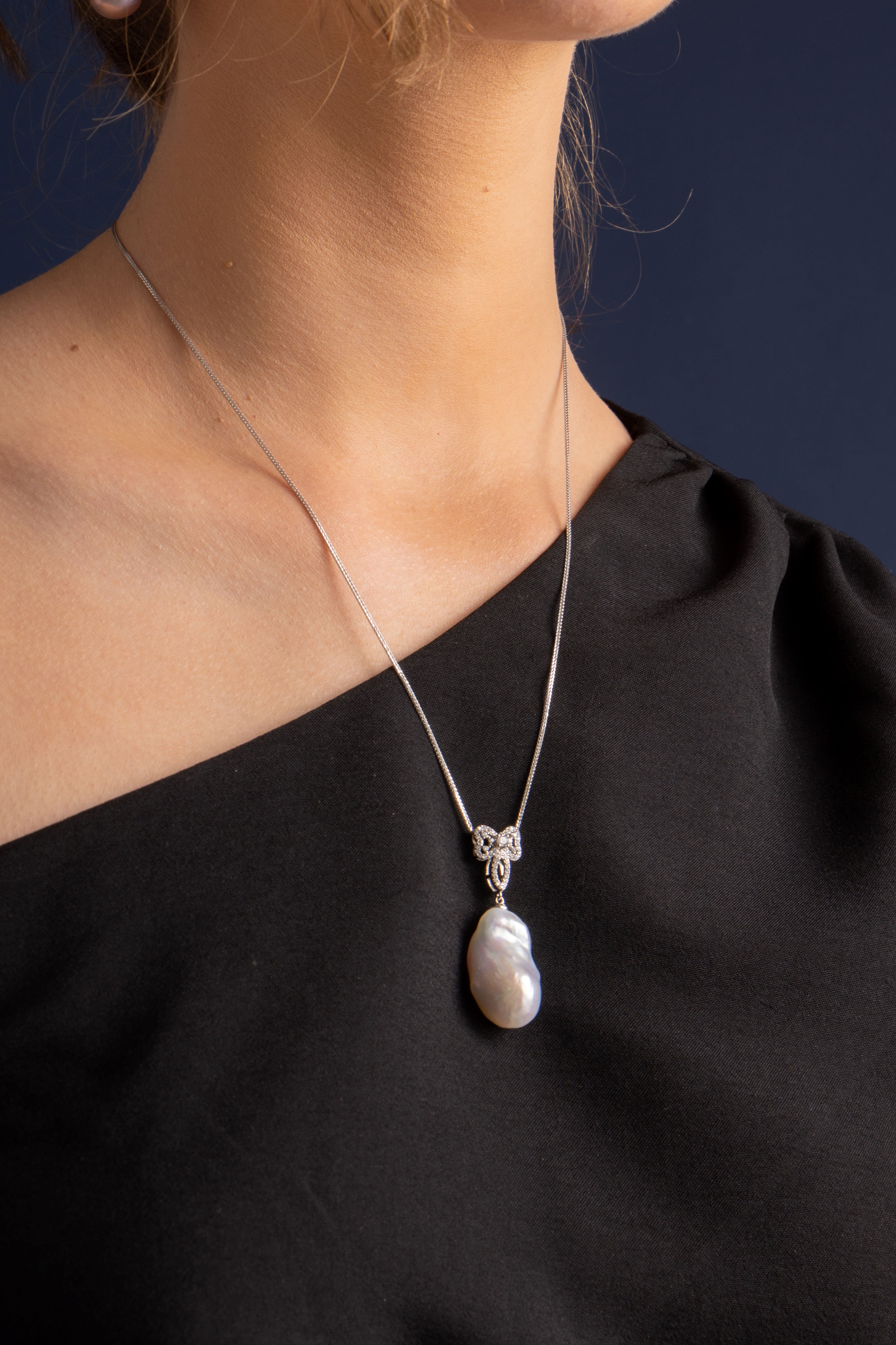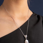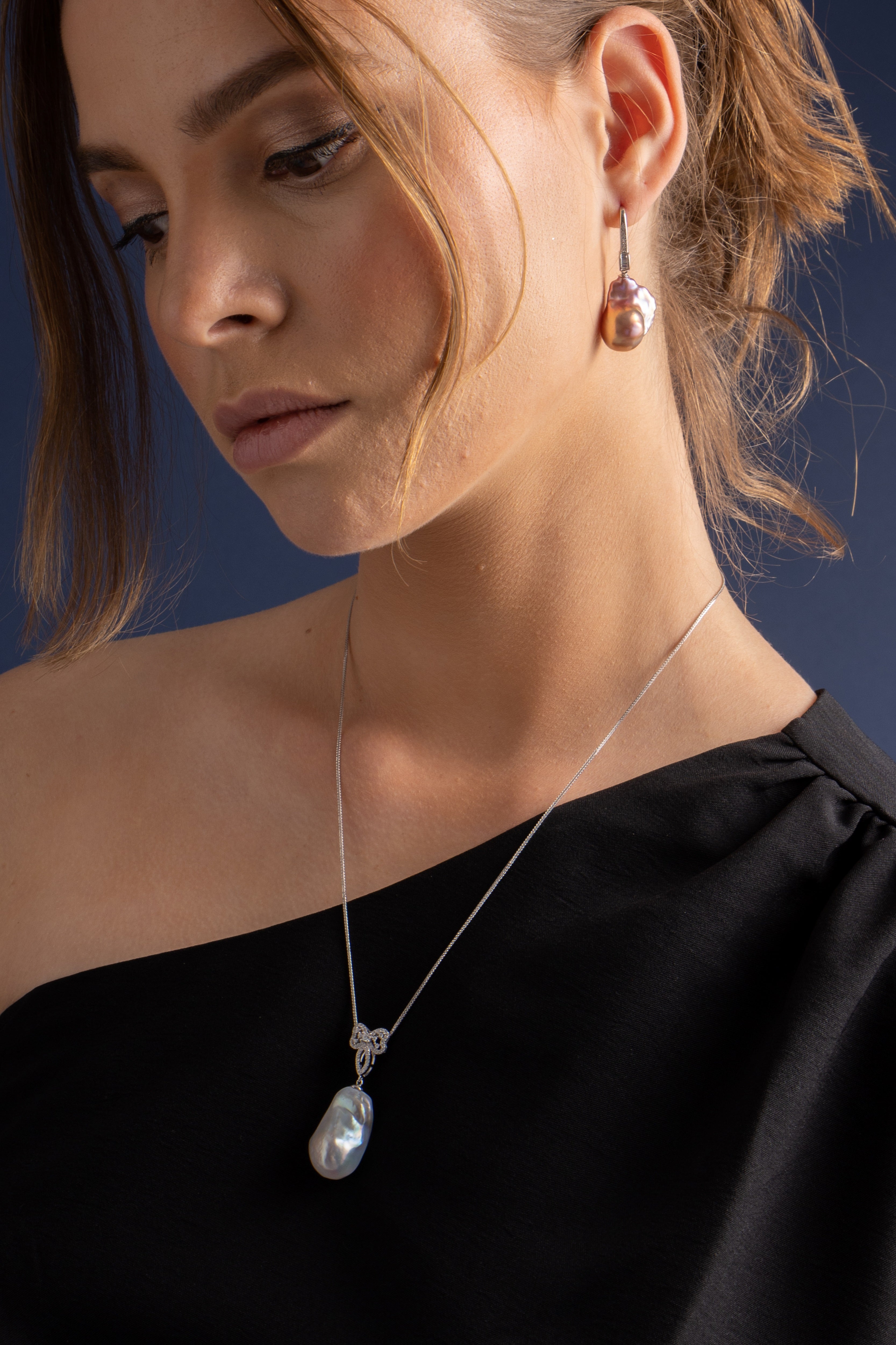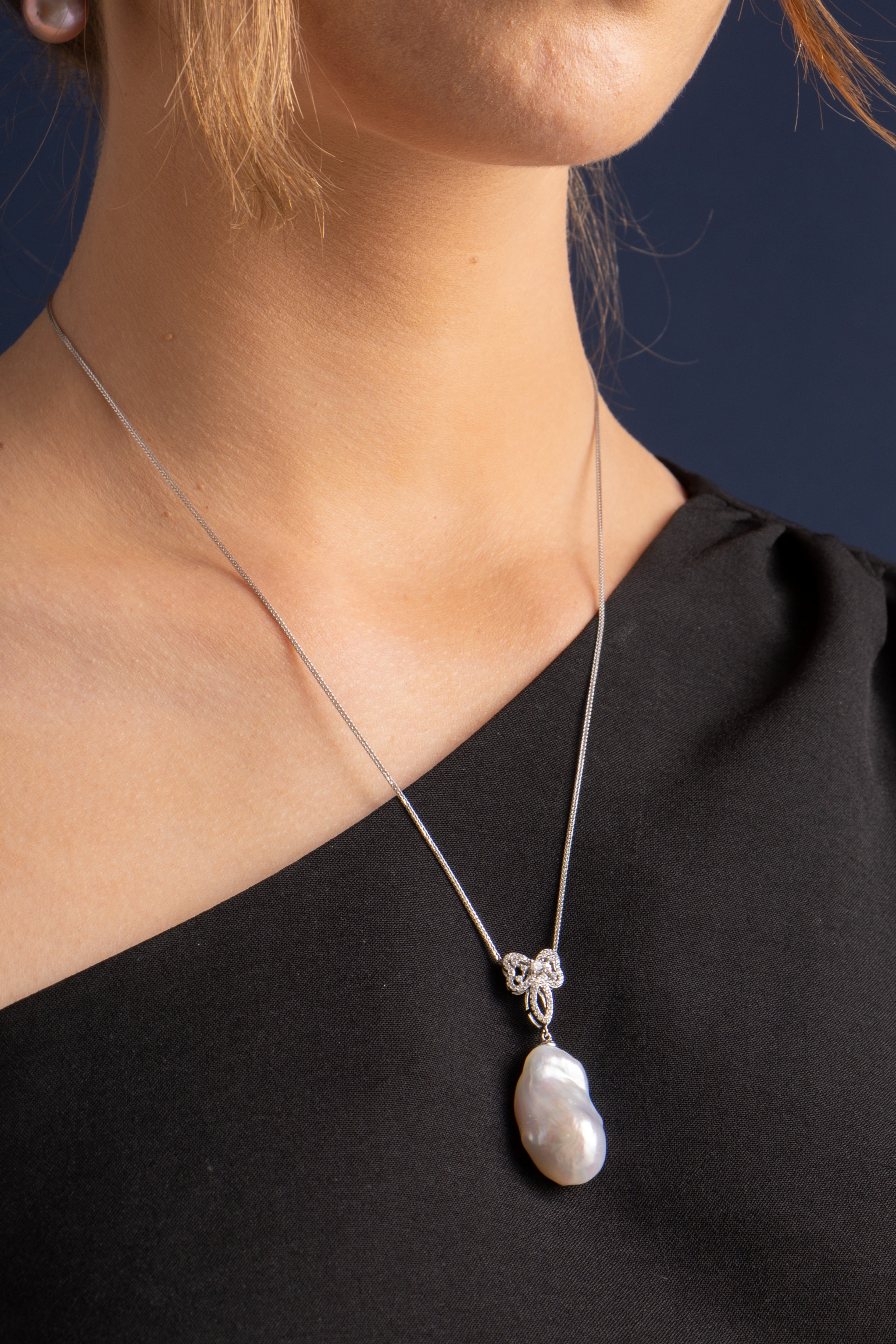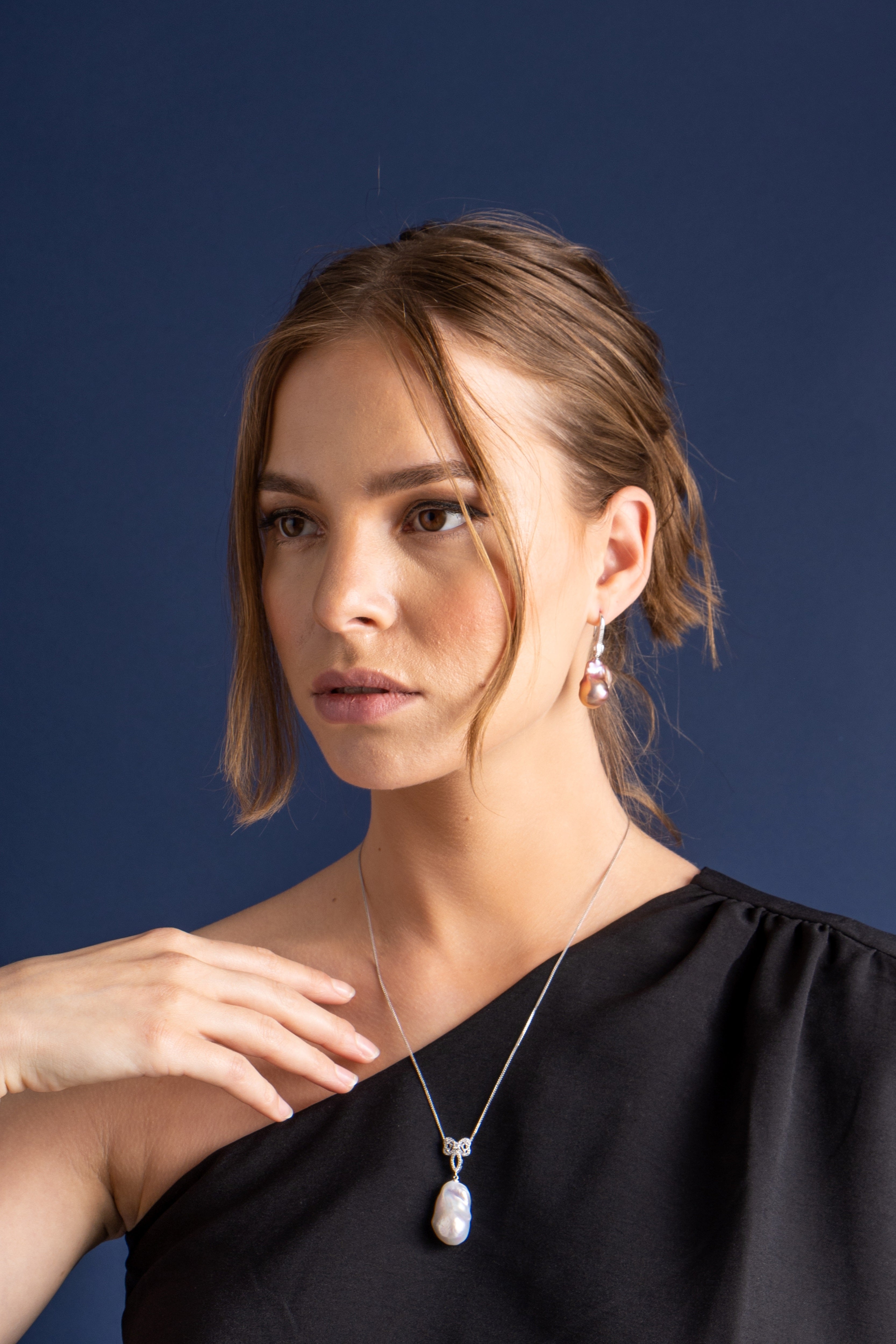 Fresh Water Baroque Pearl Pendant with Silver Bow Tie Necklace-White