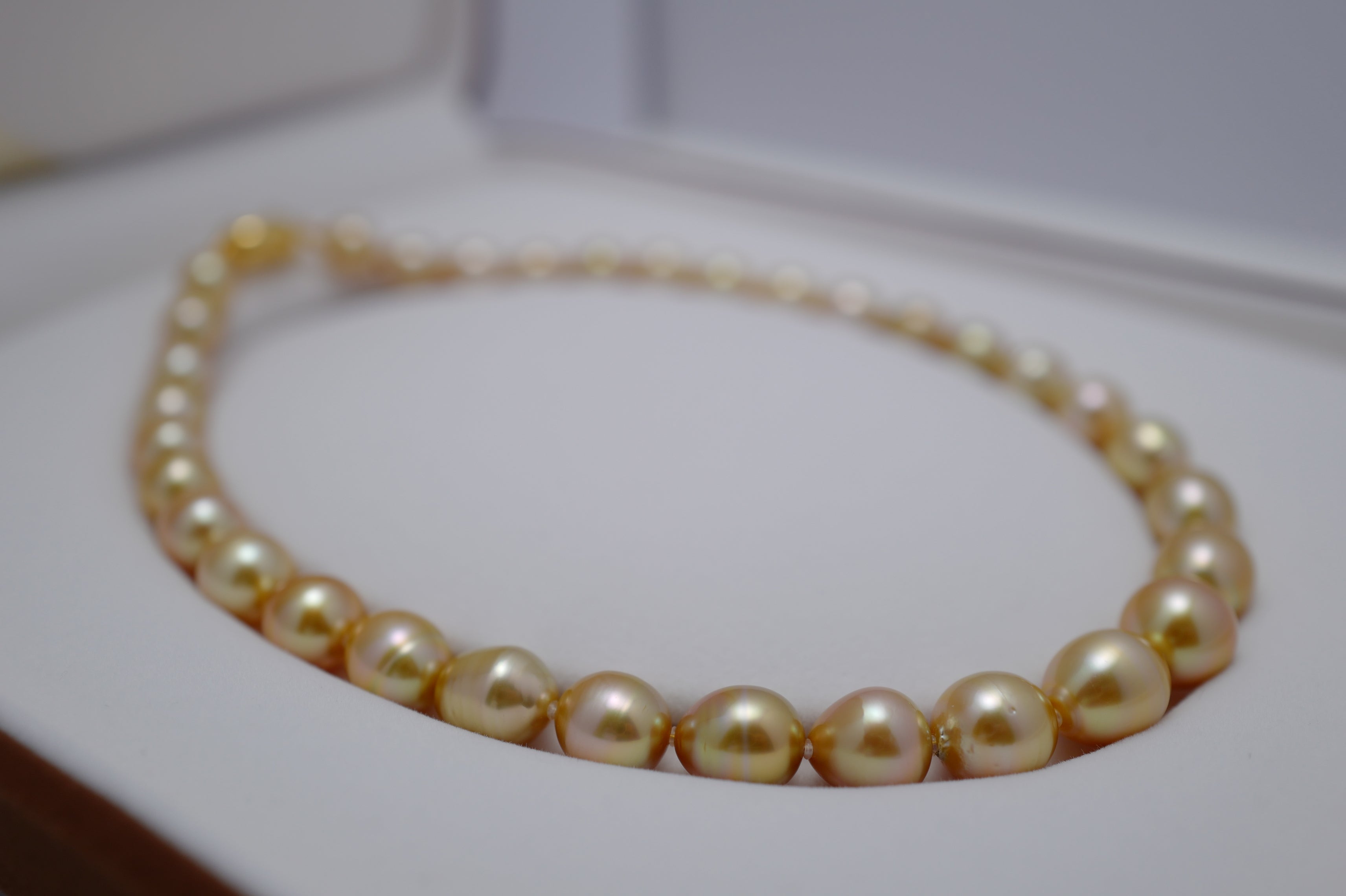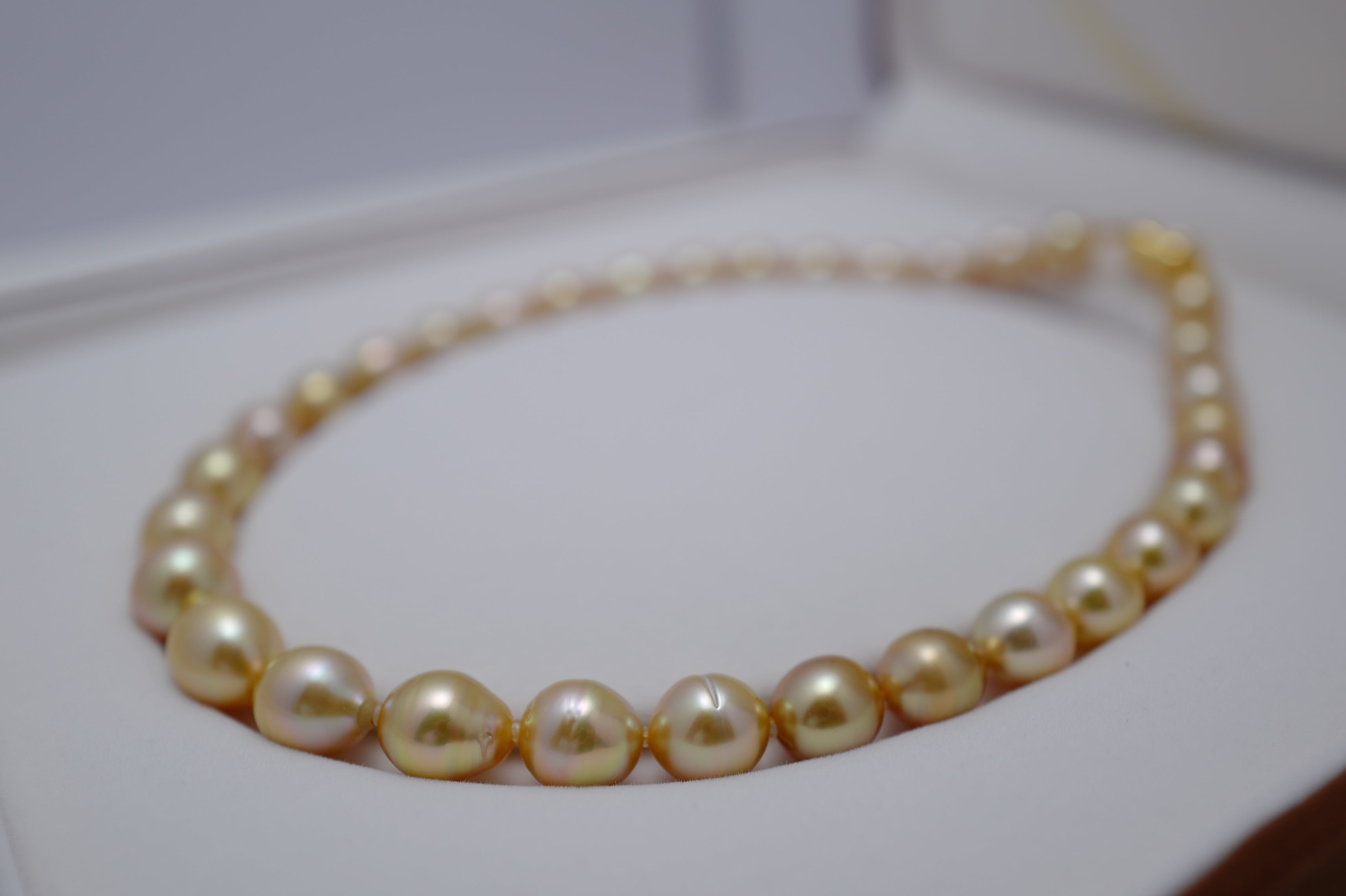 The warm yellow hues of these rare pearls are natural and are highly prized. The 33 drop pearls have been selected from the highest quality harvests and have an excellent soft, silky lustre, with some minor irregularities being visible on their surface.