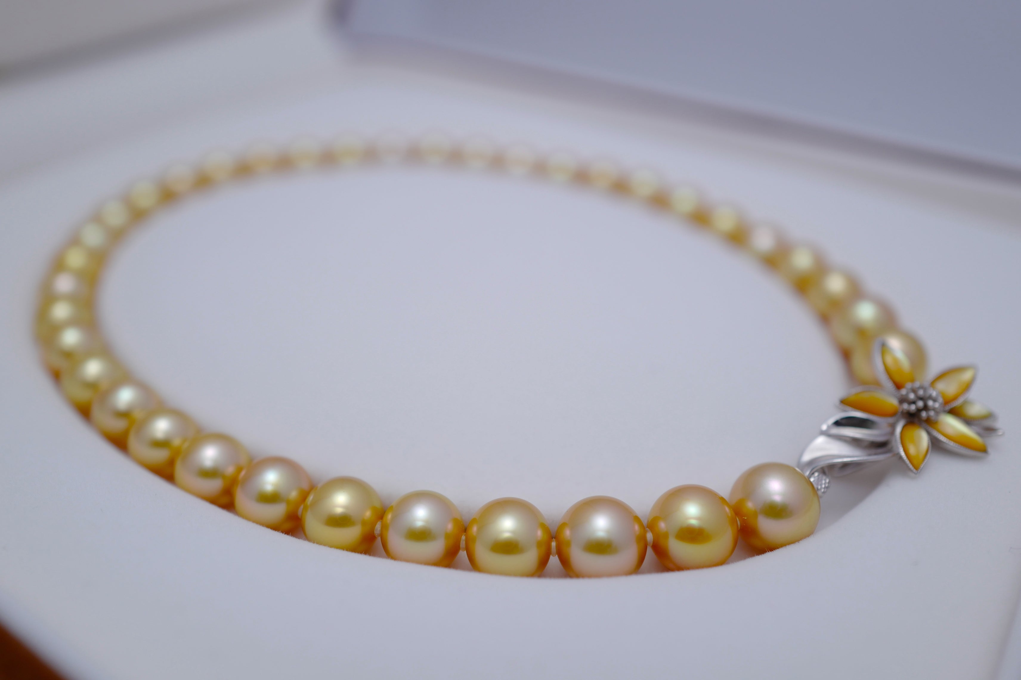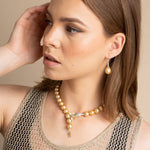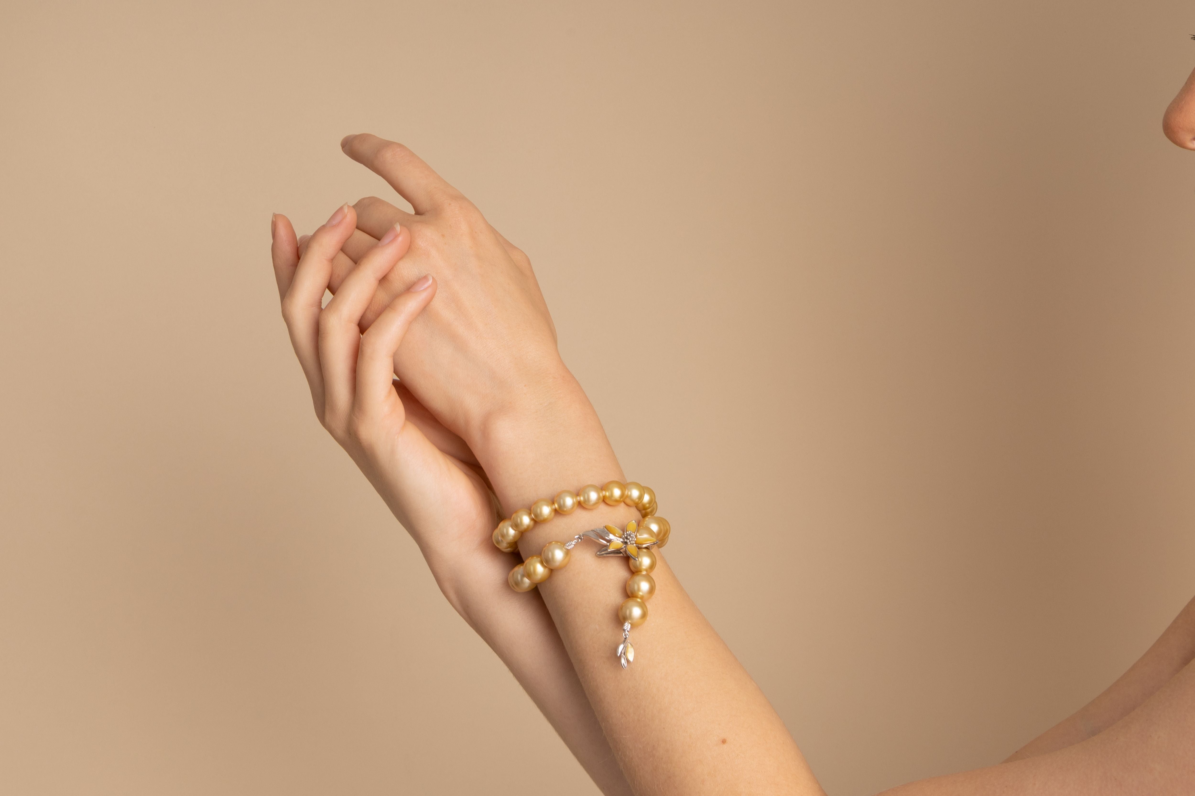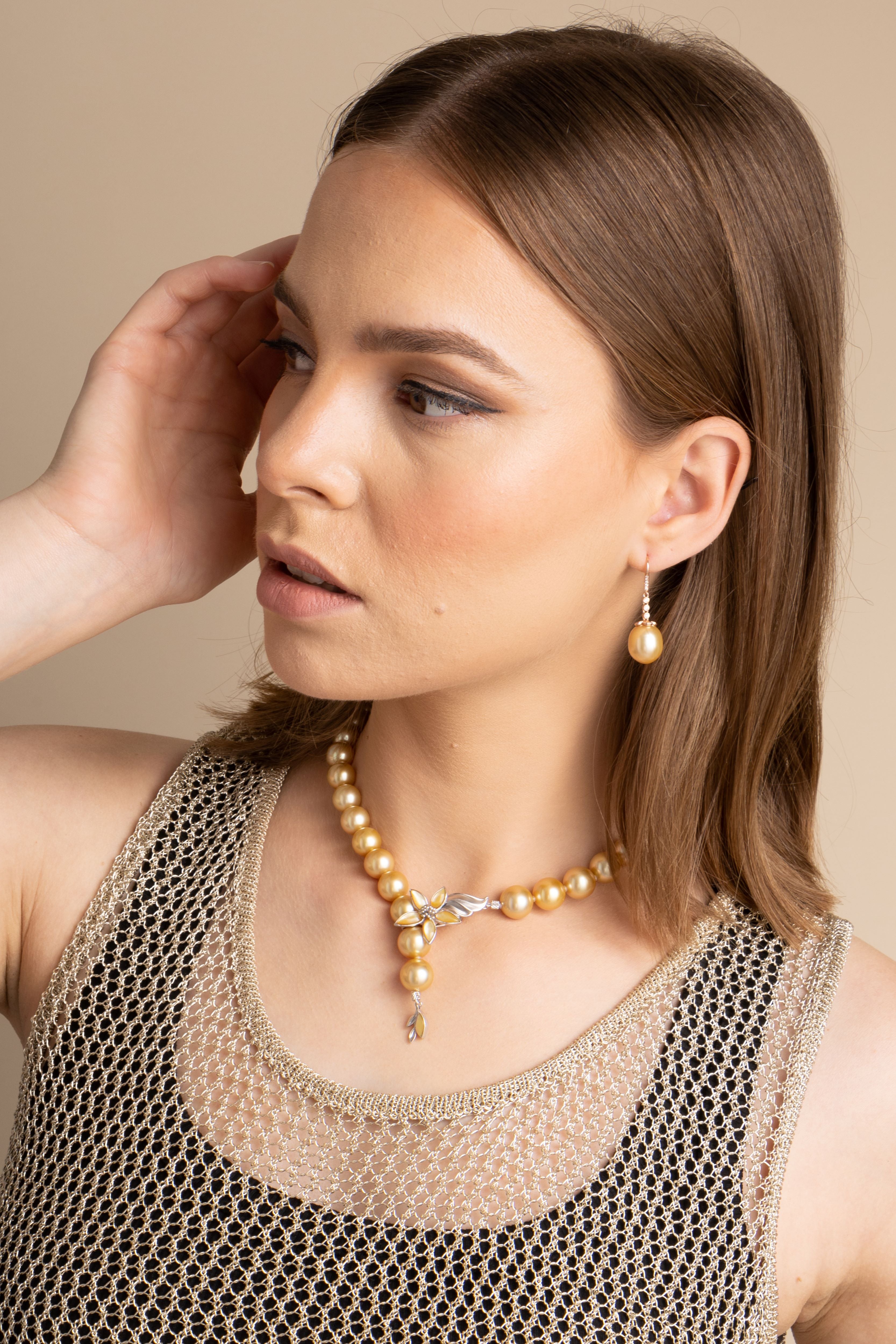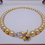 Beautiful fine jewellery for the evening, this breathtaking necklace is made with golden South Sea pearls, cultured in the saltwater silver and gold-lipped Pinctada maxima oysters in the ocean waters of the Philippines, Myanmar, Indonesia and Australia.