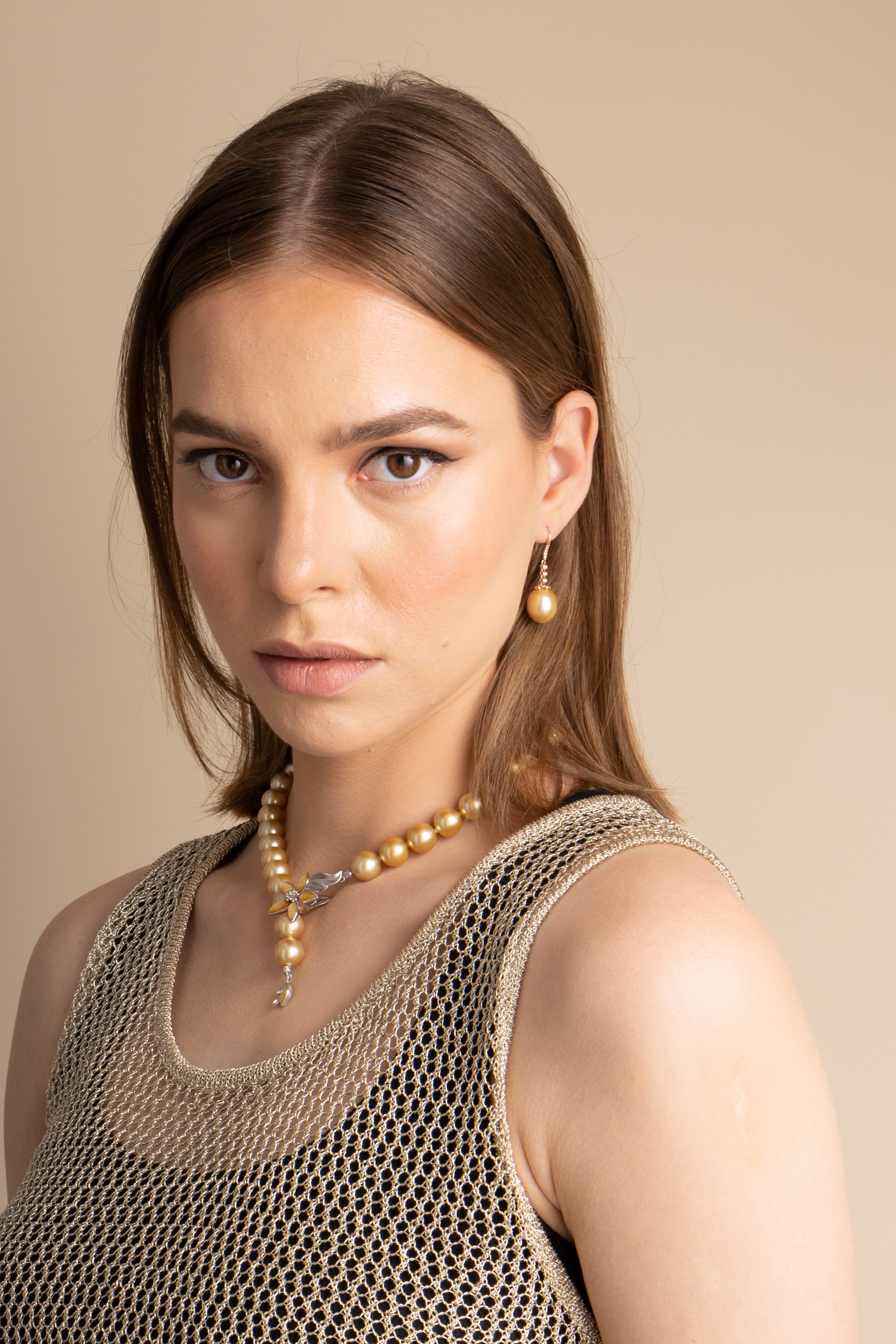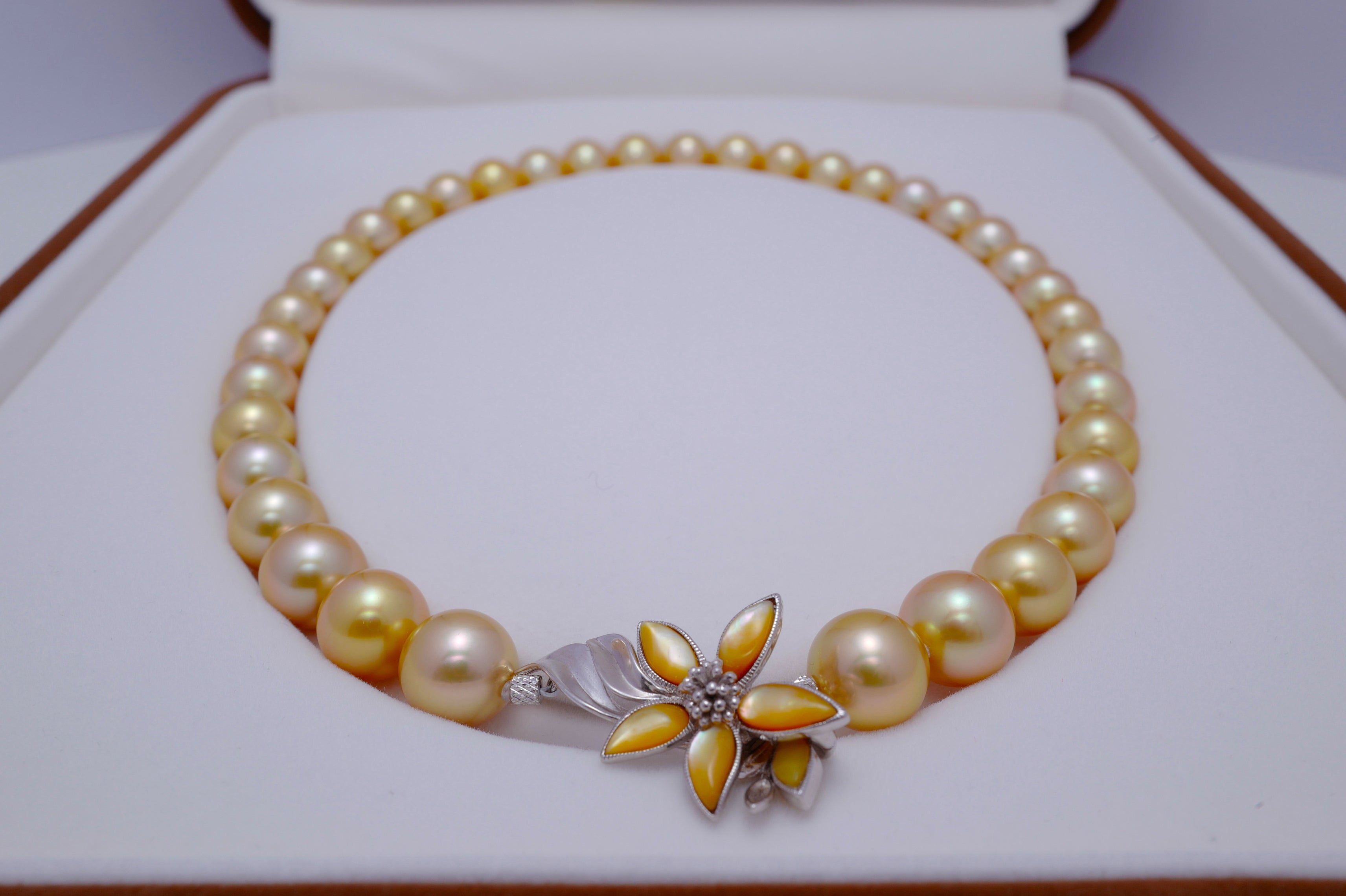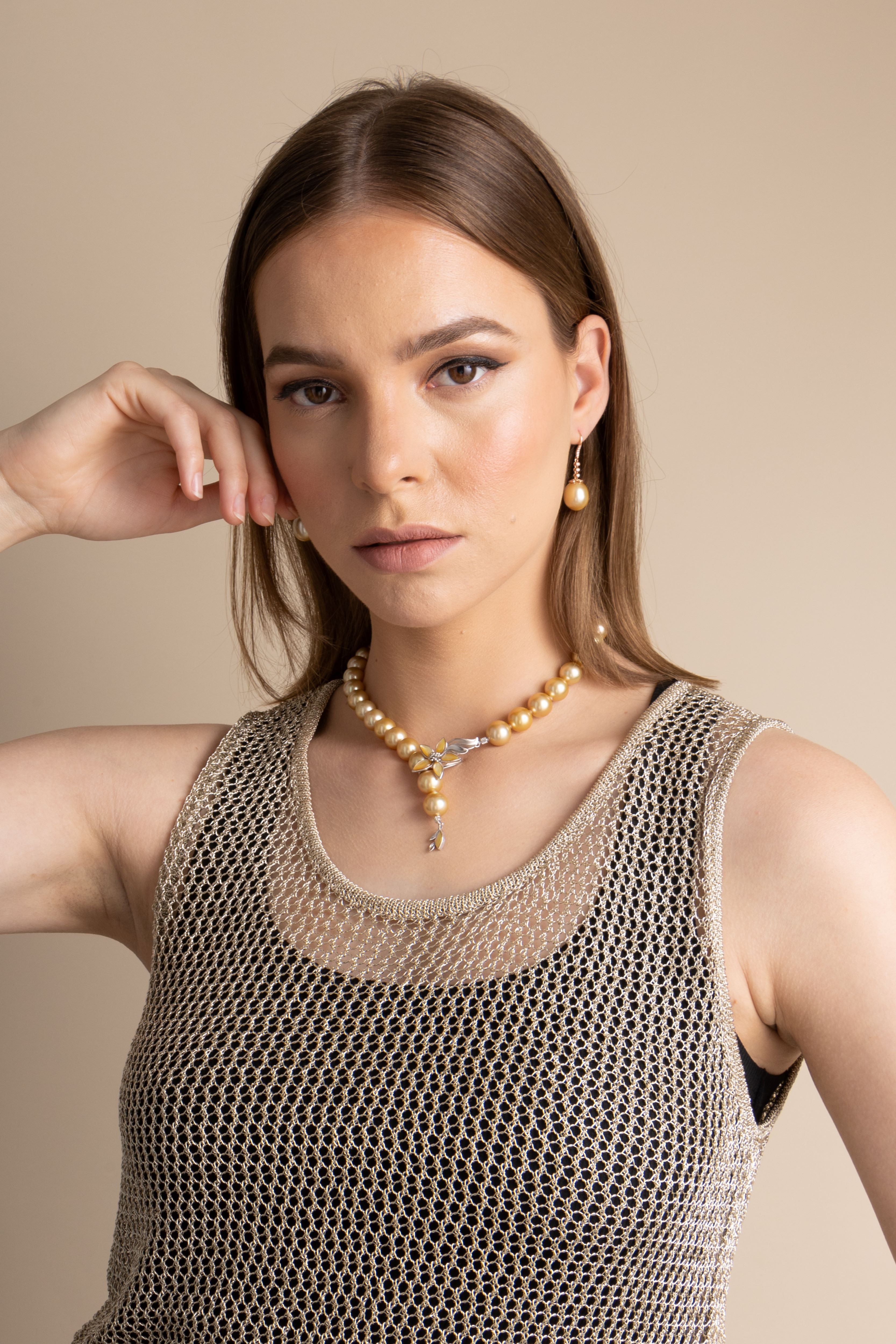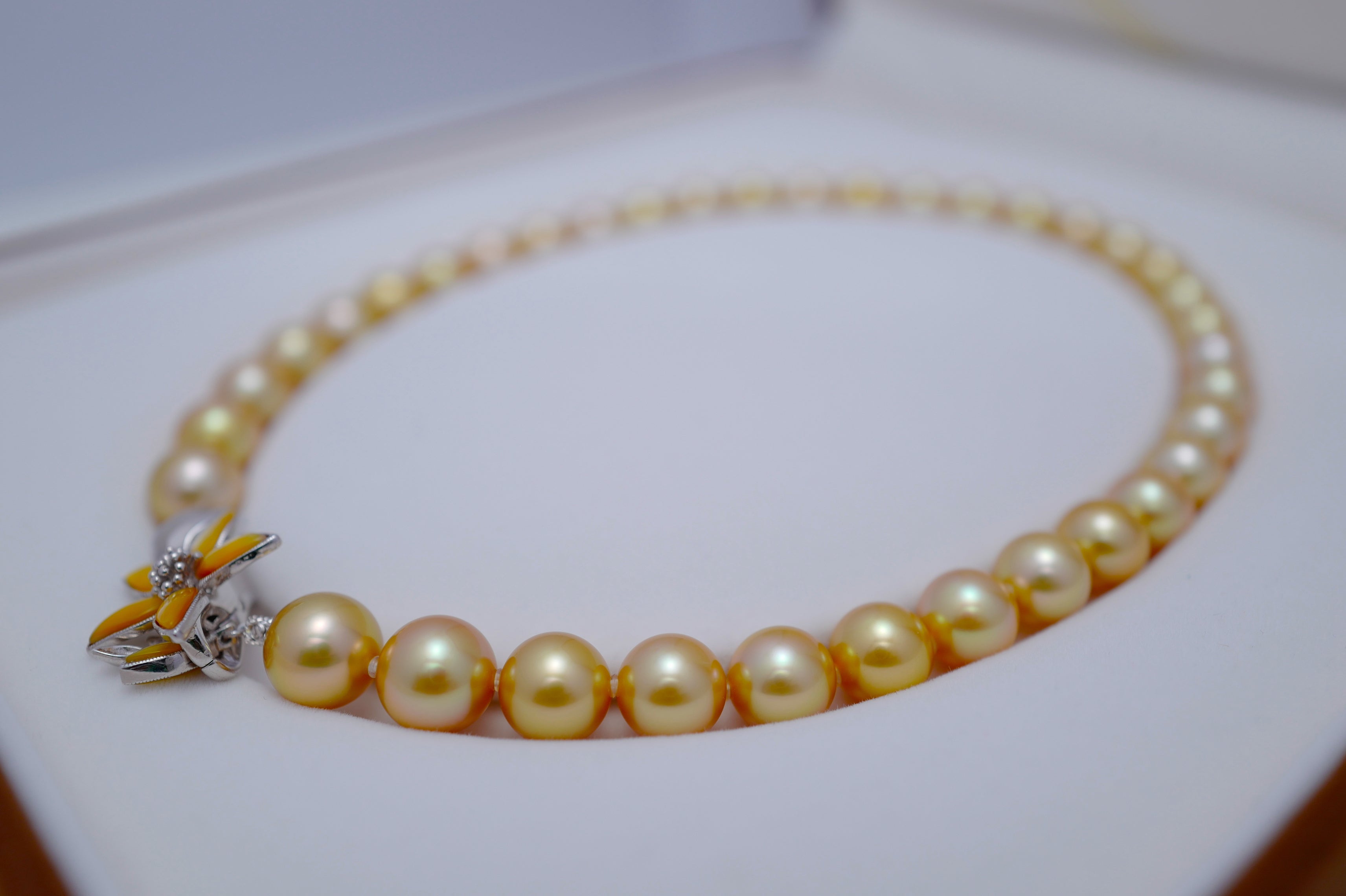 Beautiful fine jewellery for the evening, this breathtaking necklace is made with golden South Sea pearls, cultured in the saltwater silver and gold-lipped Pinctada maxima oysters in the ocean waters of the Philippines, Myanmar, Indonesia and Australia.