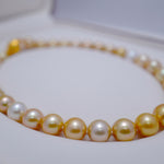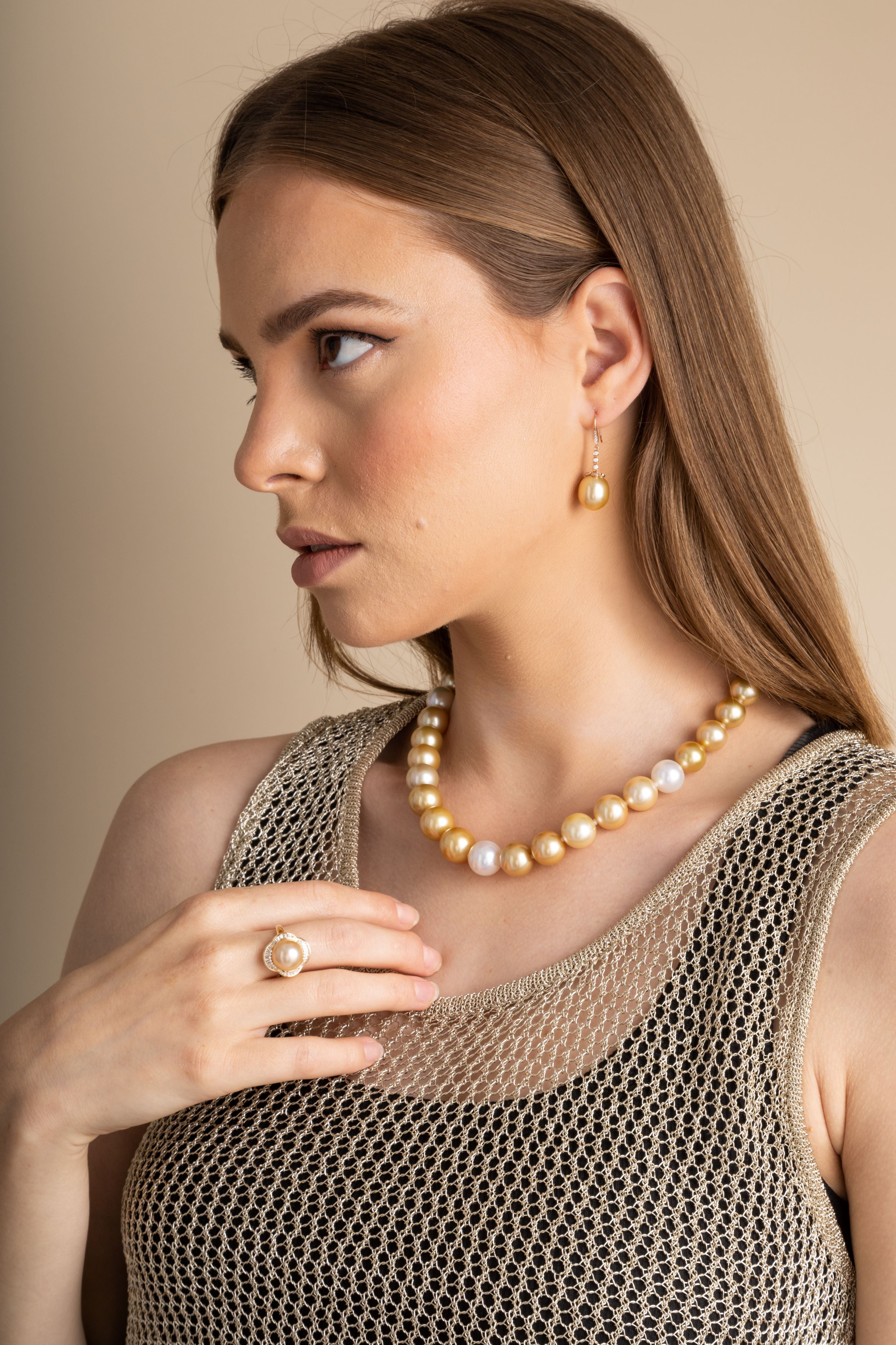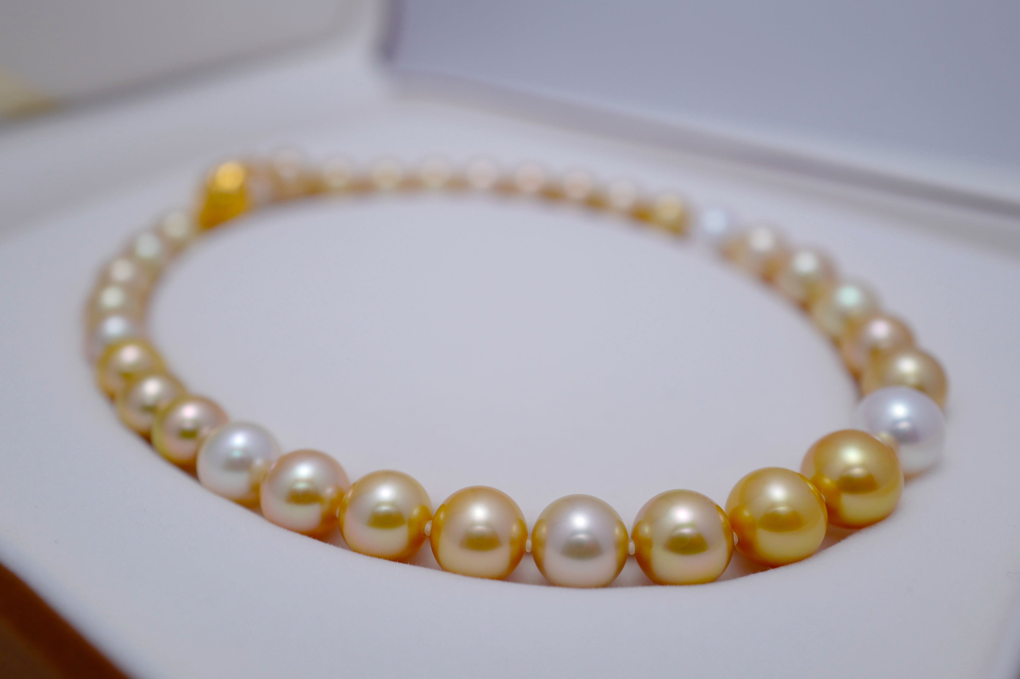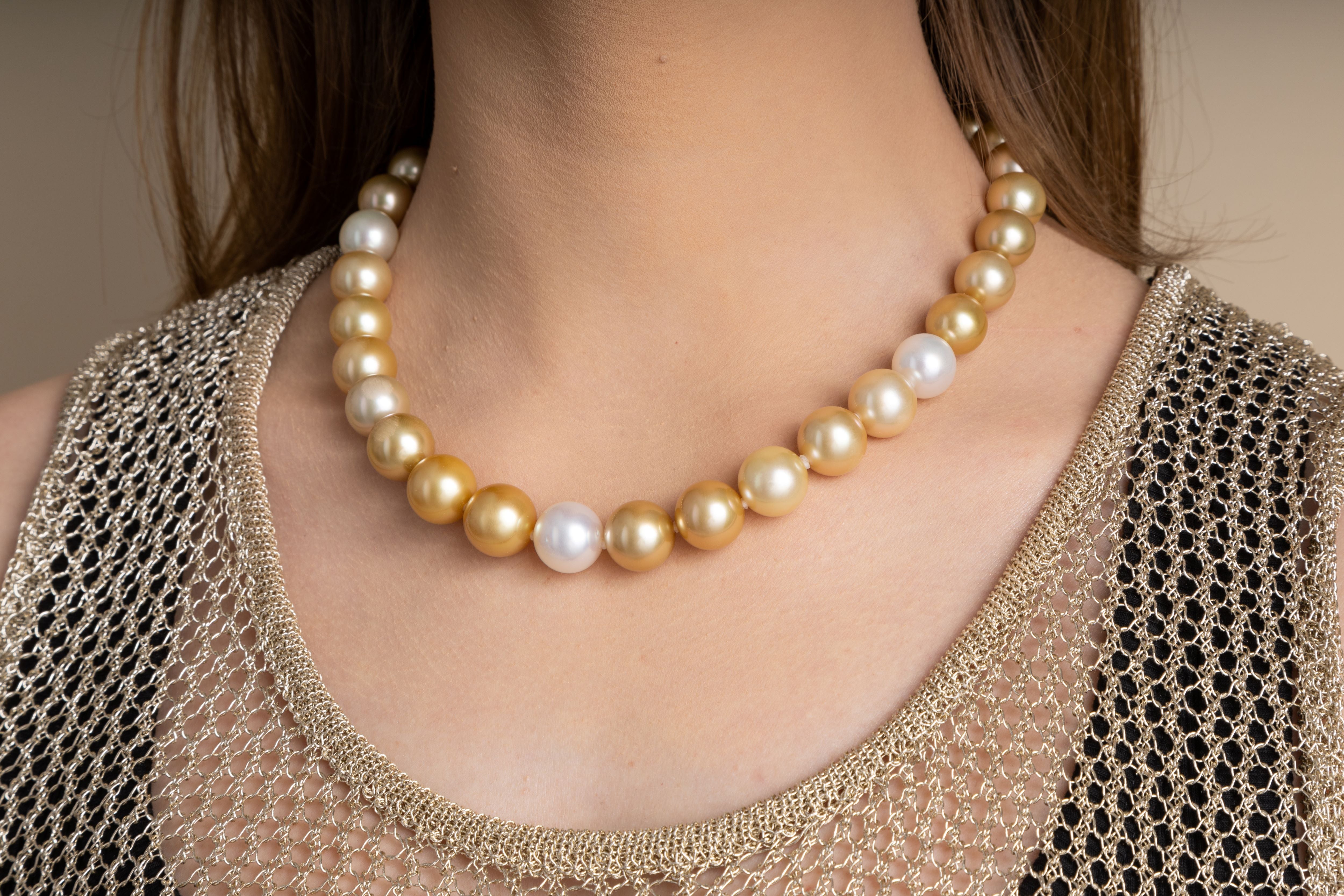 Beautiful fine jewellery for the evening, this breathtaking necklace is made with golden and white South Sea pearls, cultured in the saltwater silver and gold-lipped Pinctada maxima oysters in the ocean waters of the Philippines, Myanmar, Indonesia and Australia.