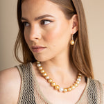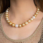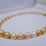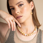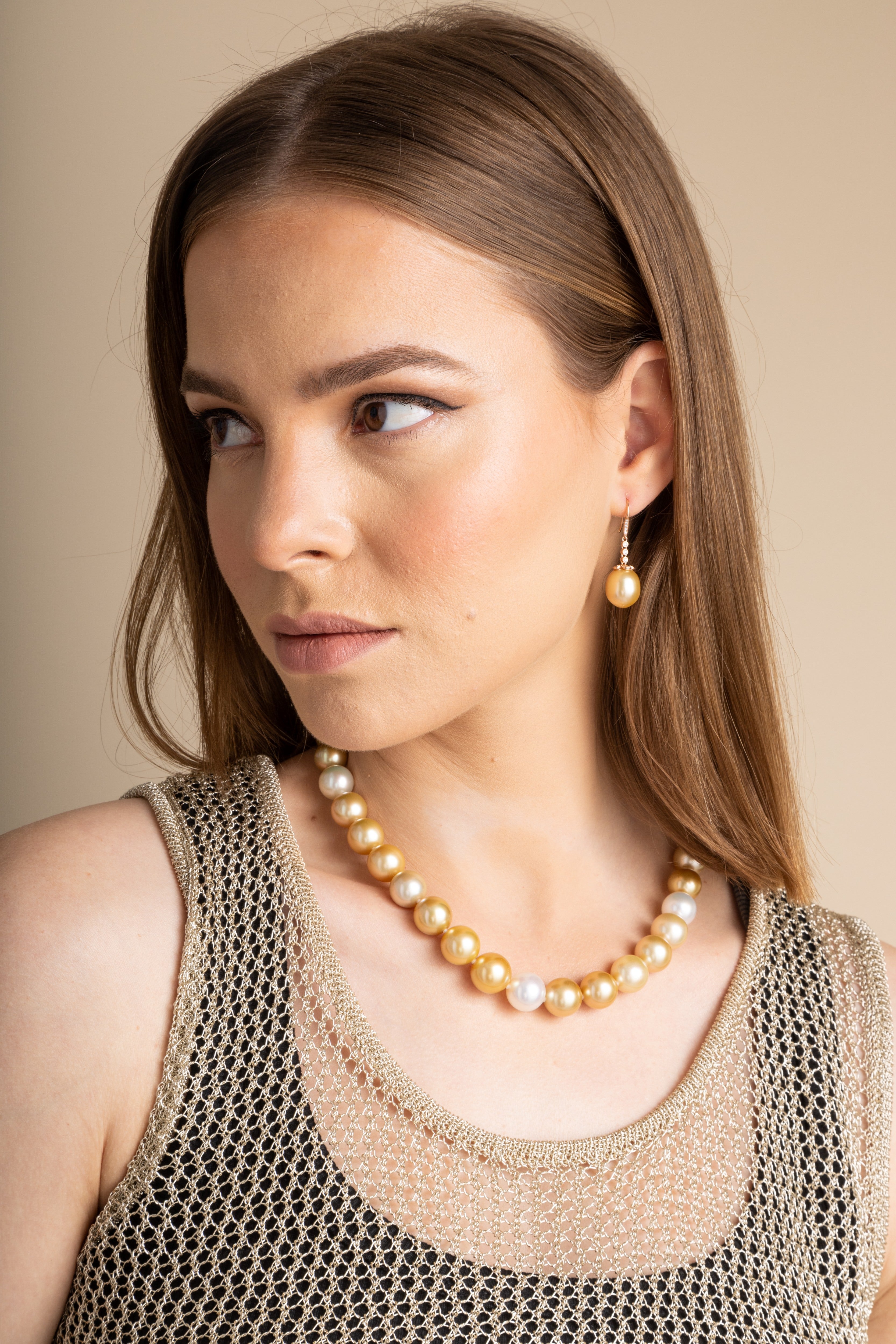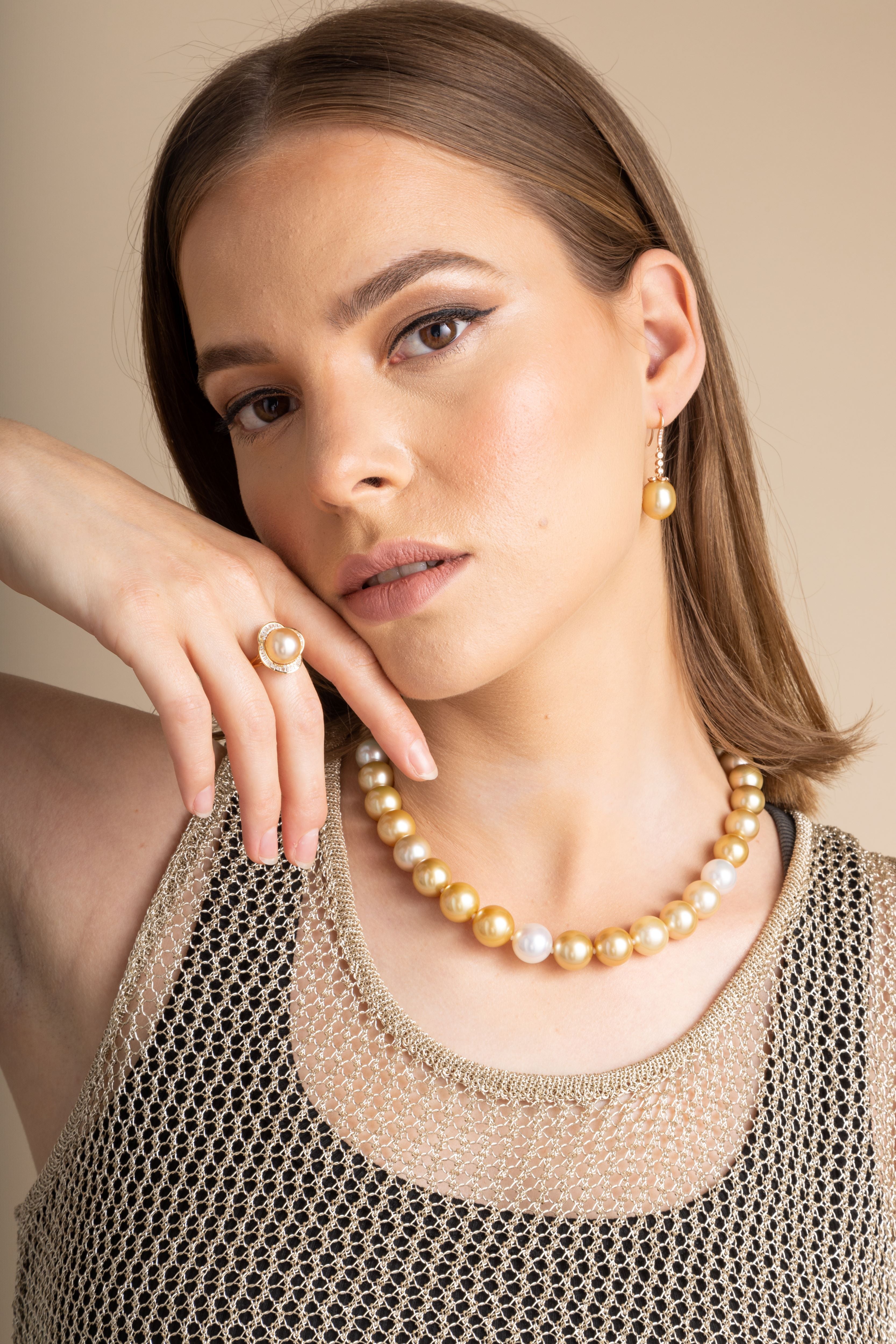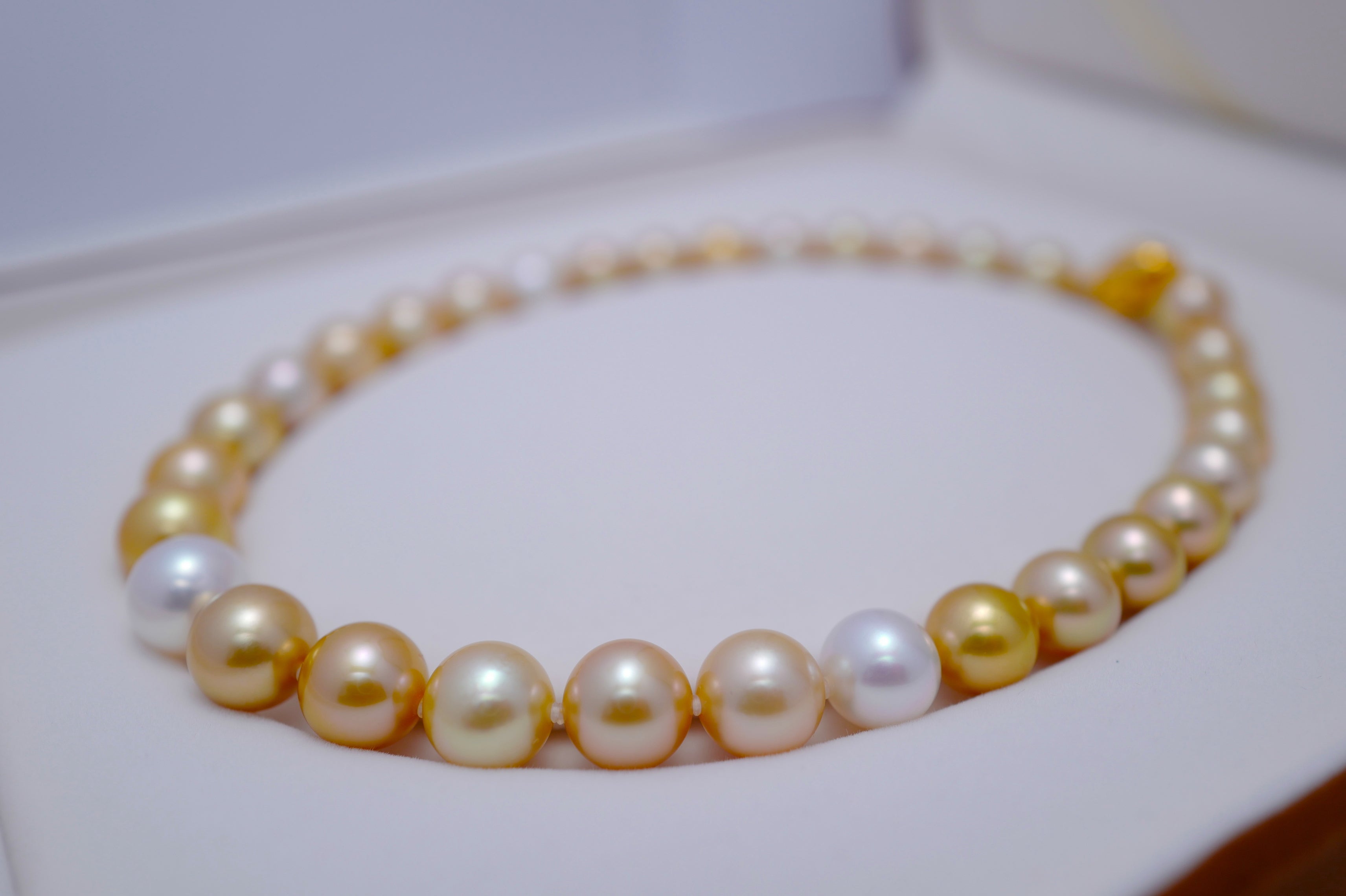 Beautiful fine jewellery for the evening, this breathtaking necklace is made with golden and white South Sea pearls, cultured in the saltwater silver and gold-lipped Pinctada maxima oysters in the ocean waters of the Philippines, Myanmar, Indonesia and Australia.